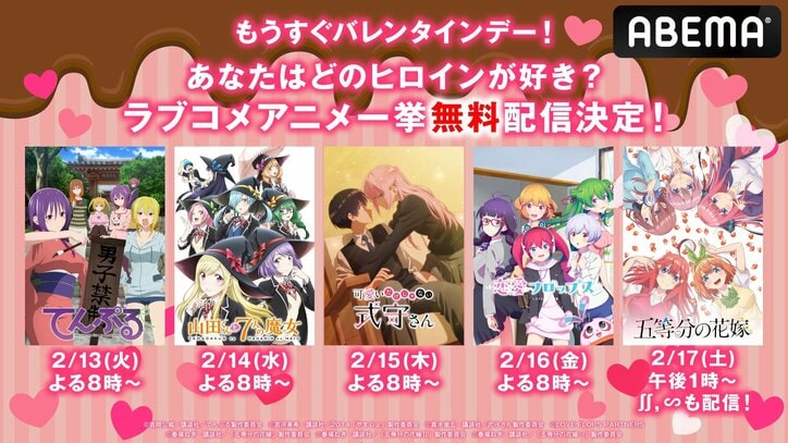 ABEMAでは「どのヒロインが好き?ラブコメアニメ一挙配信!」と題し、2月13日(火)から、人気ラブコメアニメ5シリーズ全7作品を続々と全話無料一挙放送する、バレンタイン特別企画が開催される。