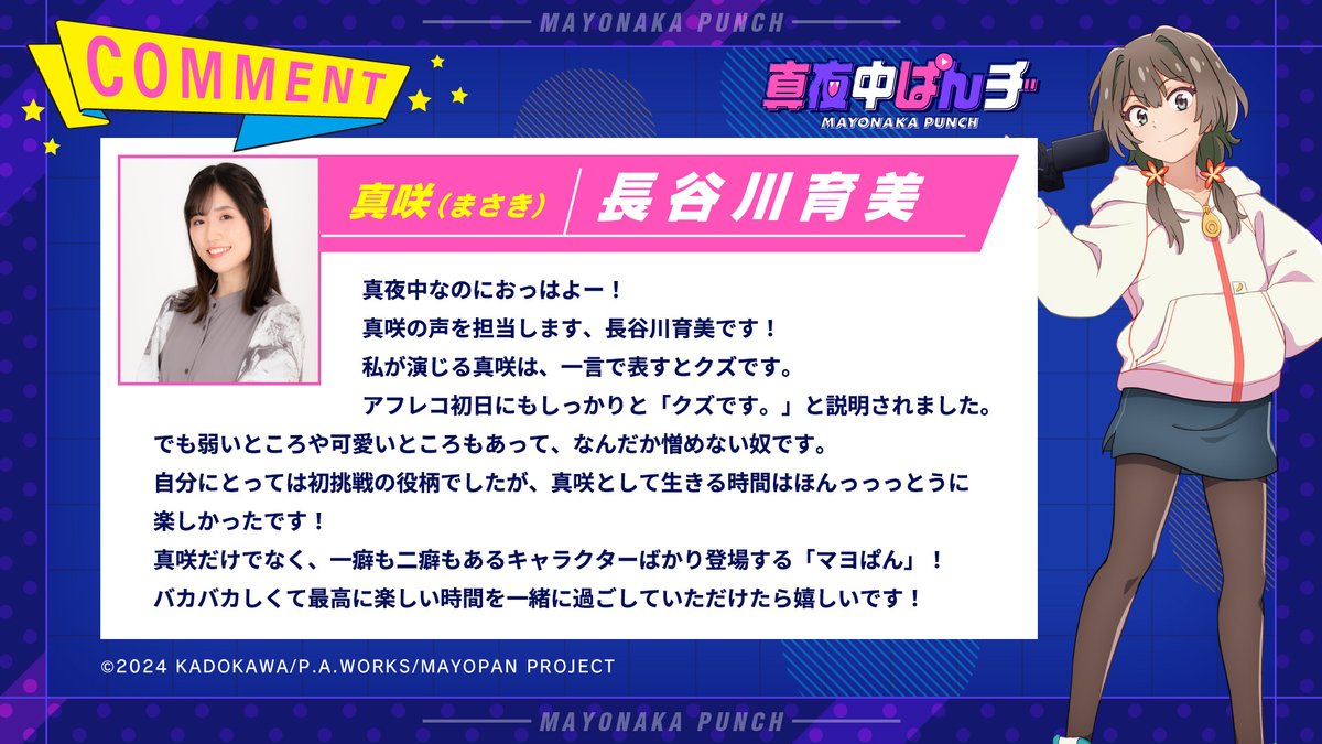 P.A.WORKS制作によるオリジナルTVアニメ「真夜中ぱんチ」の主人公・真咲役を長谷川育美が担当することが明らかに。合わせて真咲のキャラクタービジュアルおよびスポット映像が公開された。