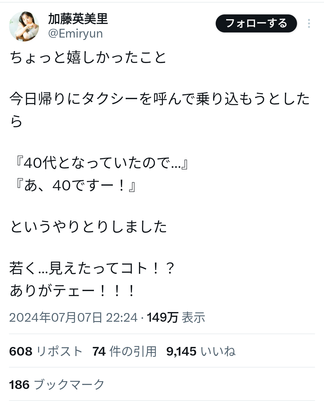 声優の加藤英美里さん、タクシー運転手にヤングに見られてウキウキに🤗