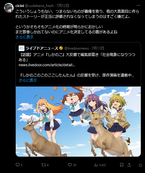 アニメ評論家「しかのこみたいなつまらない物が覇権を取り、他の大真面目に作られたストーリーが正当に評価されなくなってしまうのはすごく嫌」