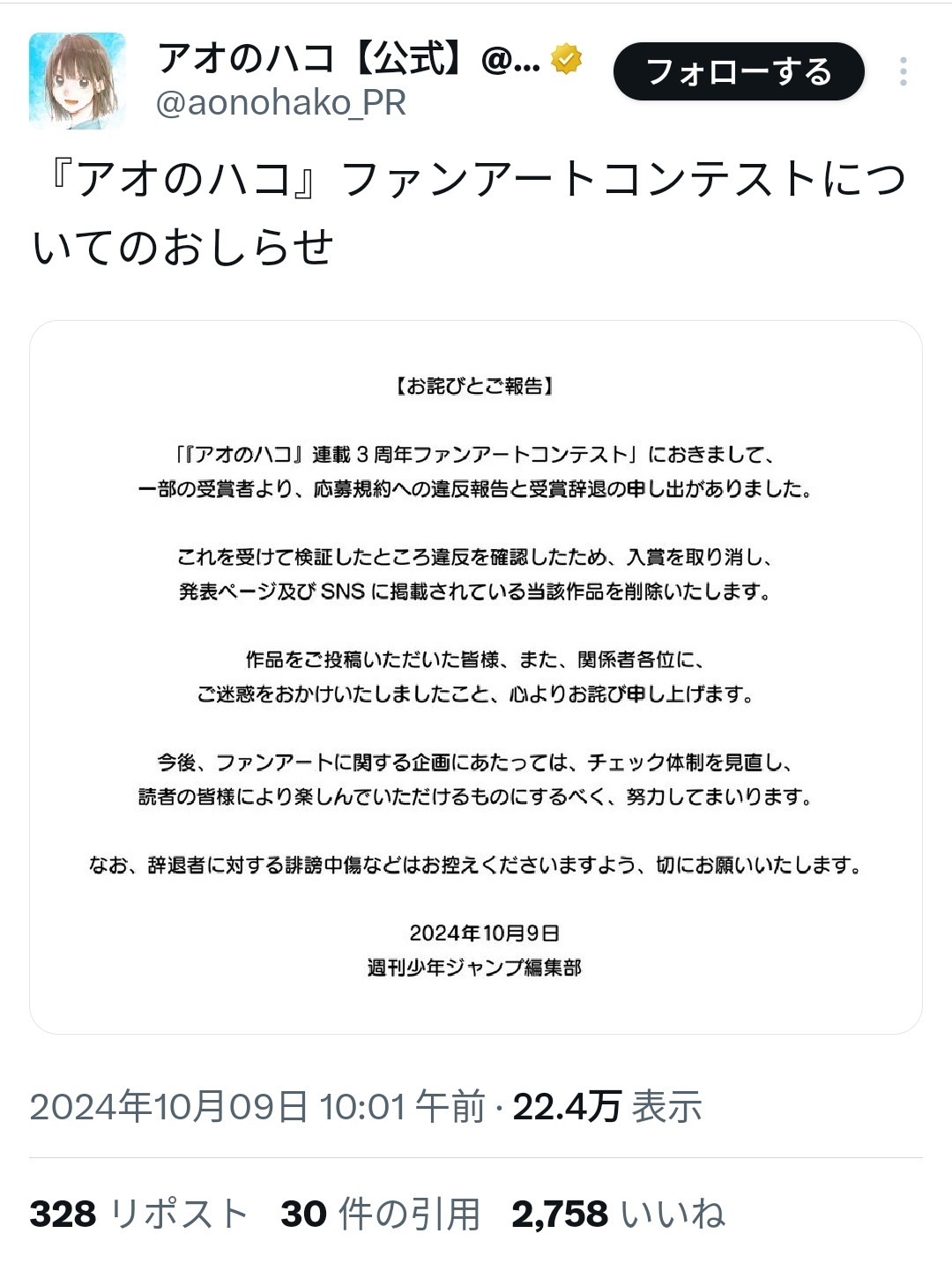 【悲報】アニメ絶賛放送中のジャンプ漫画「アオのハコ」、ファンアートコンテストでトレスが発覚し受賞が取り消されるwww