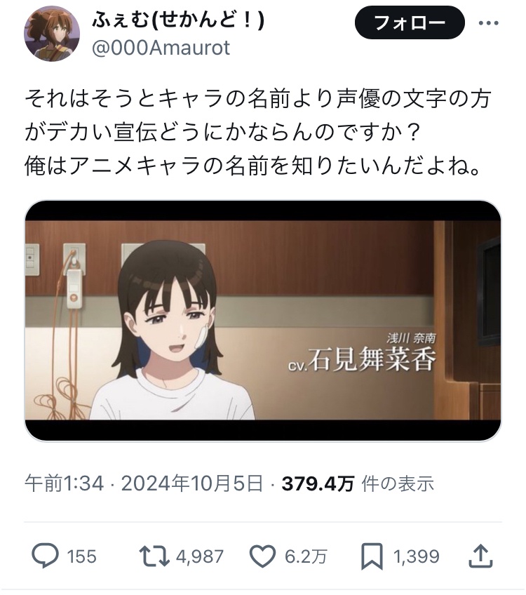 【悲報】アニメオタク「声優の名前をキャラクターの名前より大きく表示しないで!!」