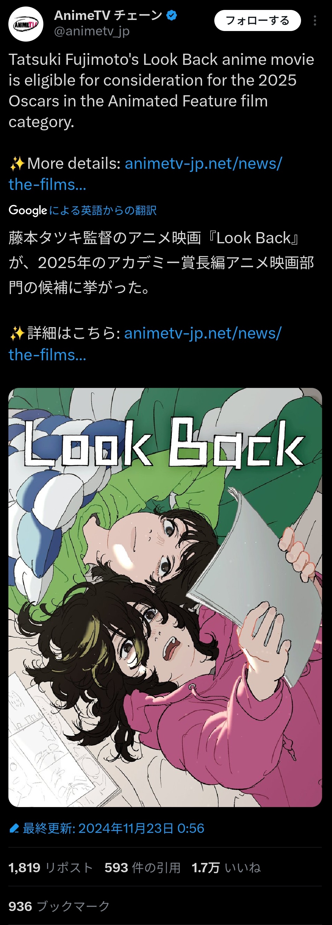 【朗報】アニメ『ルックバック』、アカデミー賞の候補に挙がってしまうwww