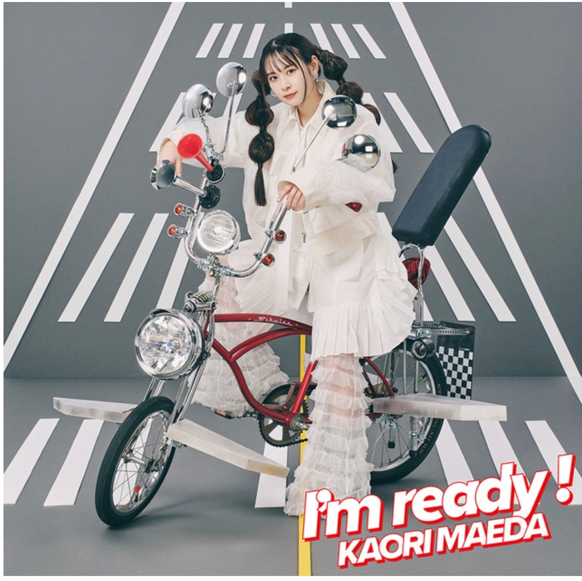 今回公開されたジャケットは、前田がみんなを連れていく準備は万端と言わんばかりの様子で滑走路に立っているビジュアル。イケイケなオープンカーやかっこいいバイクではなく、自転車にのったおちゃめな姿となっている。
