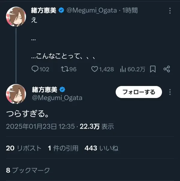 声優・緒方恵美さん「え、こんなことって……つらすぎる……。」