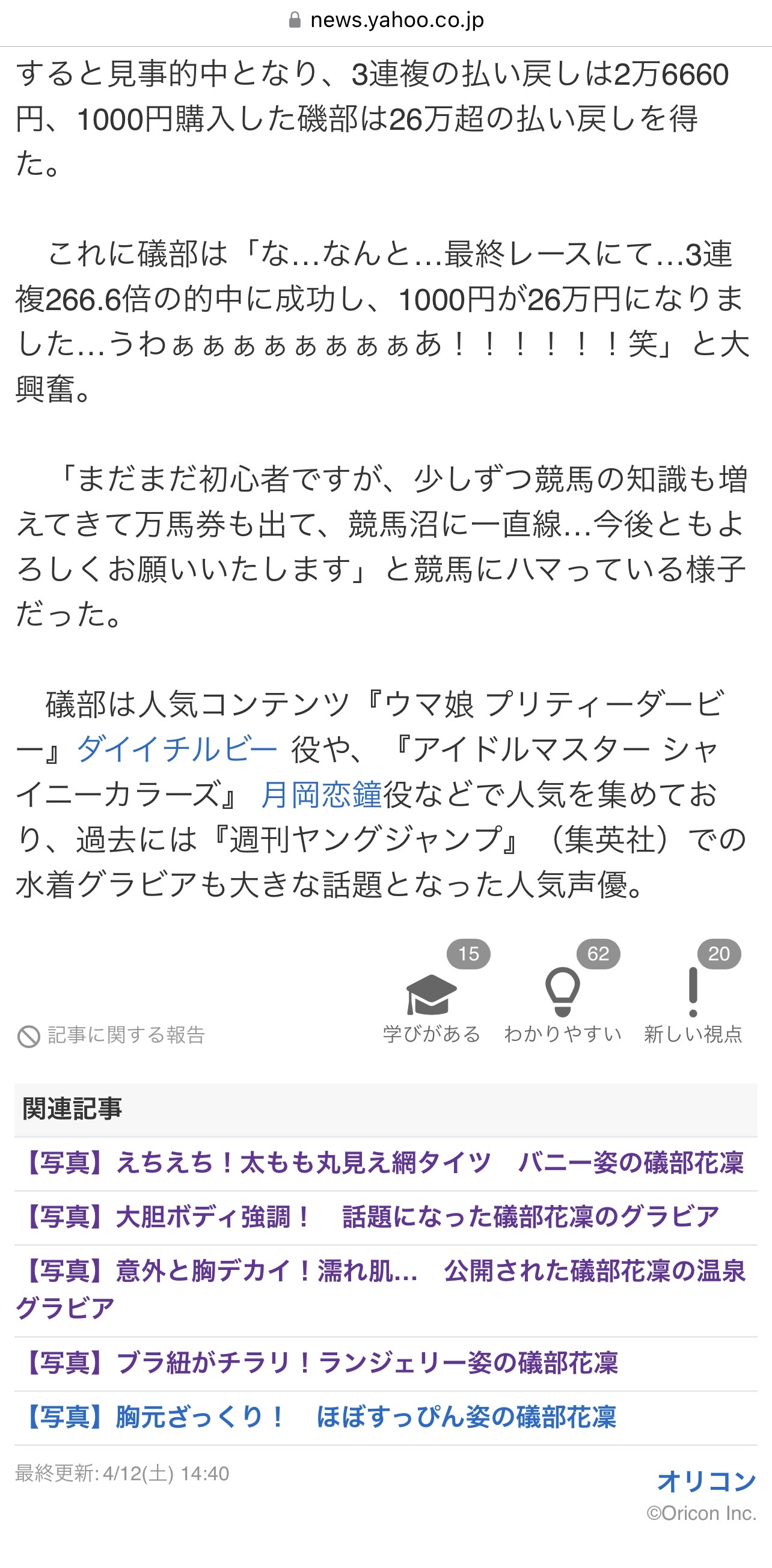 【悲報】万馬券を当てた声優・礒部花凜さんの関連記事がゲスすぎて炎上