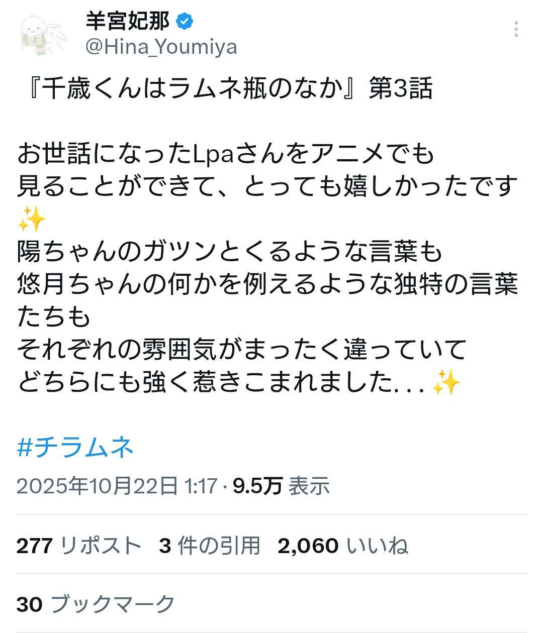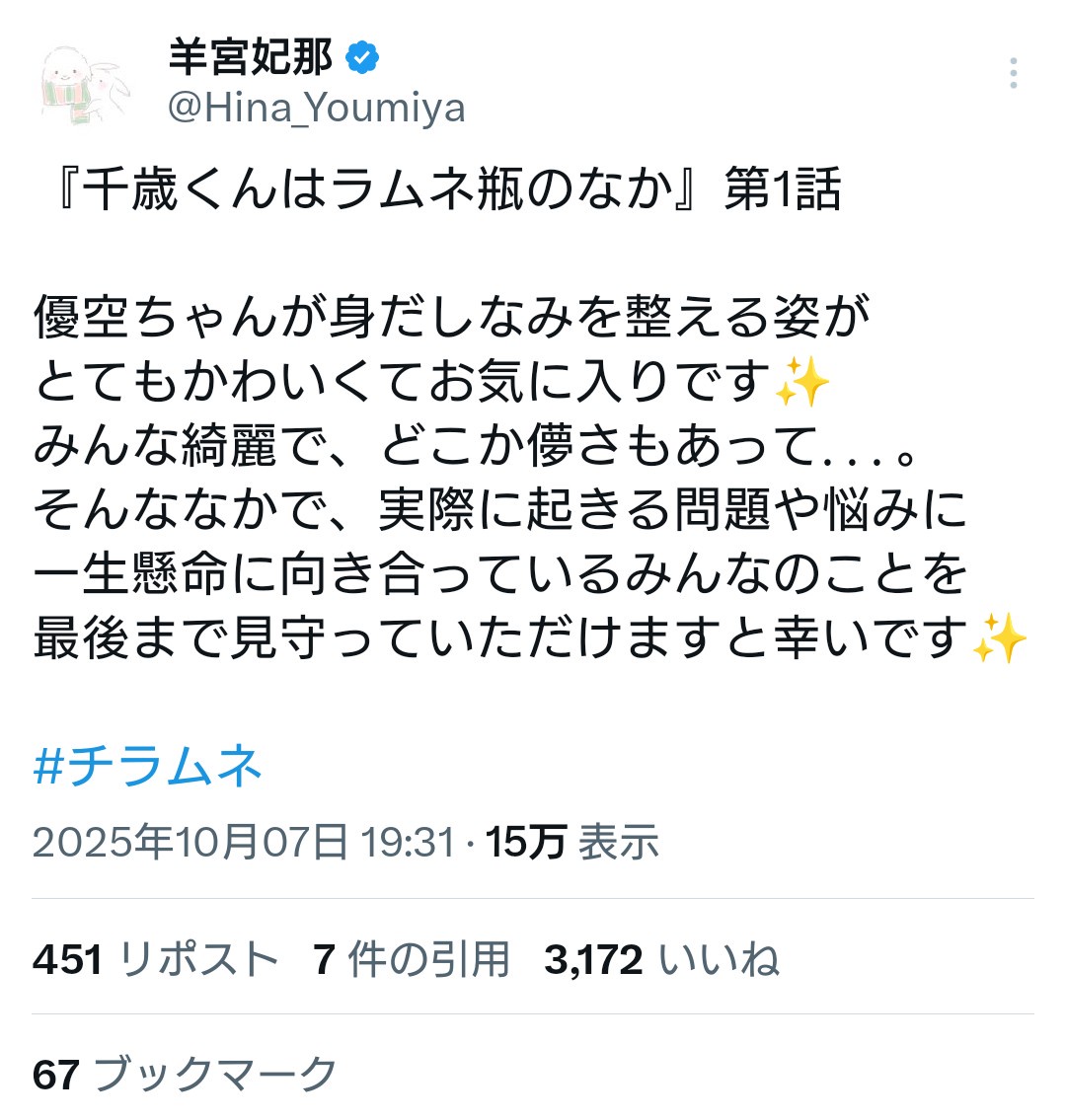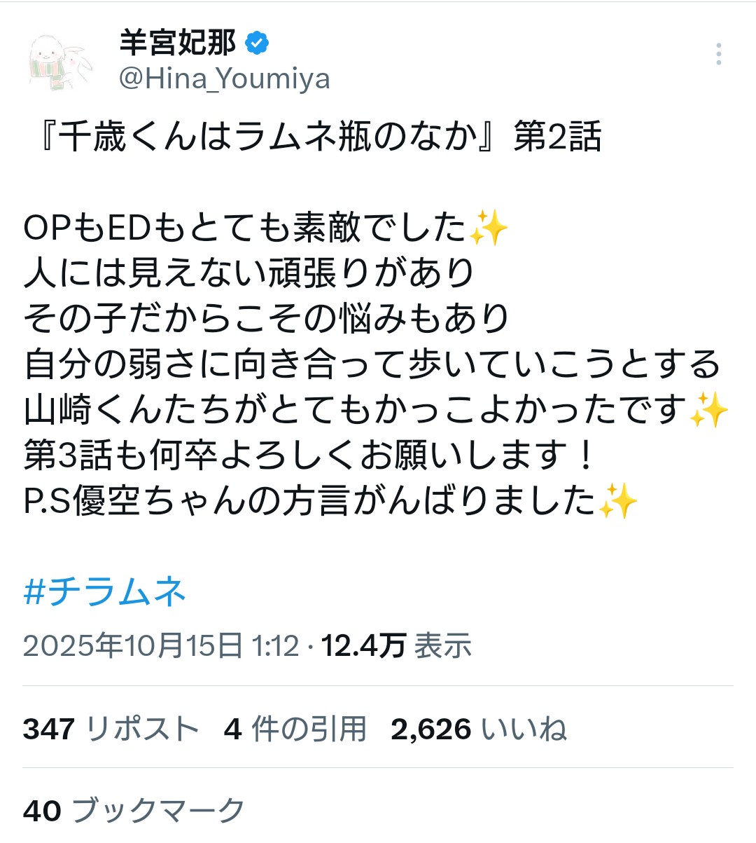 【朗報】声優・羊宮妃那ちゃん、自分が出演したアニメにもちゃんとポストで感想を書いてくれる