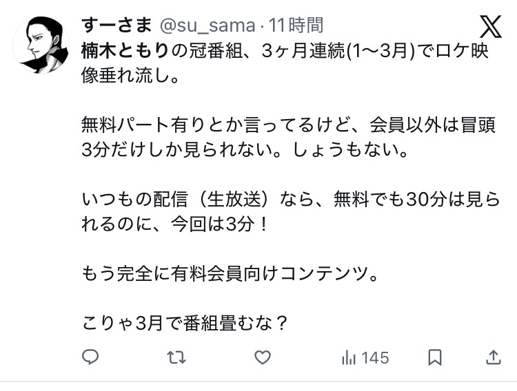 - 【悲報】楠木ともりさん、月1番組の結婚後初放送が「8分」で終わり炎上