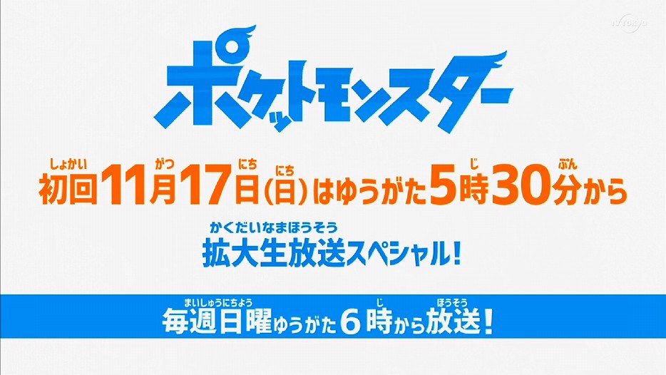 この度、TVアニメ『ポケットモンスター』新シリーズの放送日が、テレビ東京系にて11月17日(日)に決定! なんと初回はゆうがた5時30分から拡大生放送スペシャルでお届けします!