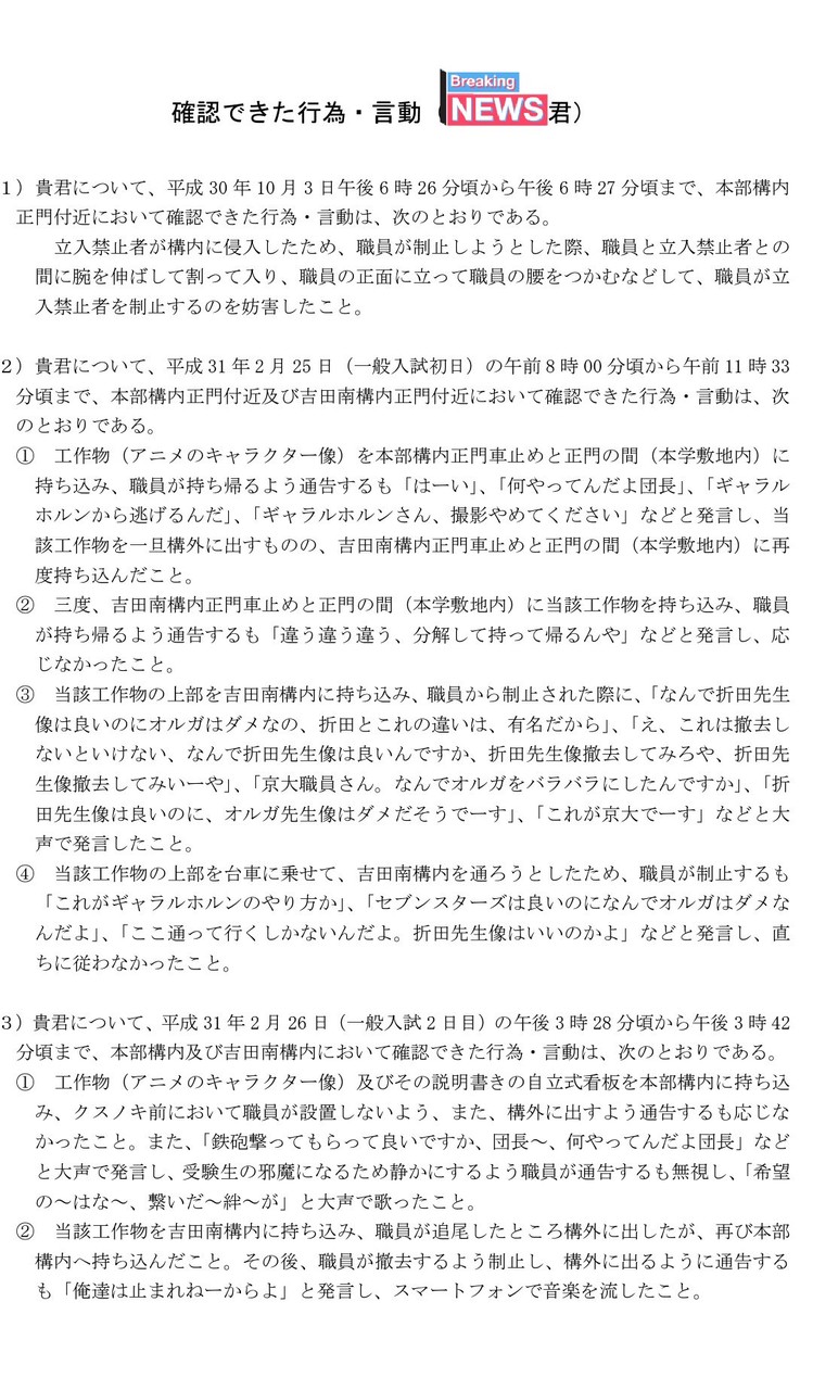 京大入試でオルガ像たてた人が、オルガ像立てた罪で停学処分になりそうなんだけど、大学から正式に送られてきた処分理由の文書(2枚目)が面白すぎるw