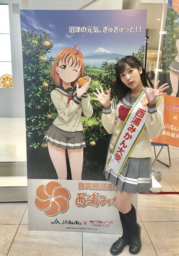 同市を舞台にしたアニメでは、高海さんの好物がミカンとされているため、JAは12日、高海さんを西浦みかん大使に任命するイベントをららぽーと沼津で開催し パネルも展示していた。
