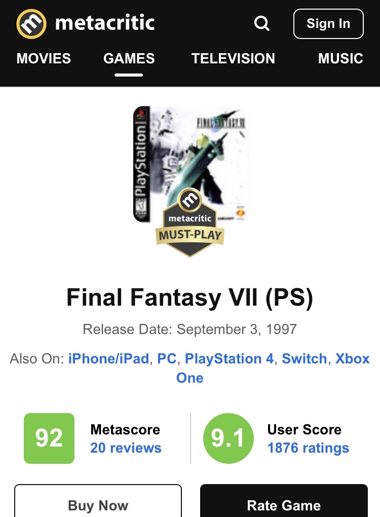 【悲報】「FF7リメイク」さん、メタスコア87点でオリジナル以下www