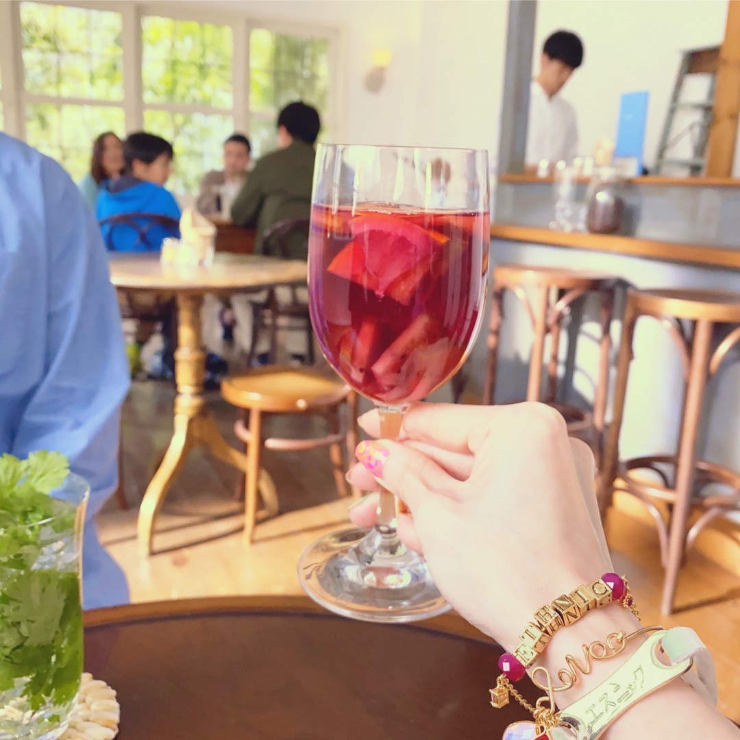 前に謎の人物、赤のサングリアと緑のパクチーサワー(?)、ブレスレッドにETHNIC
