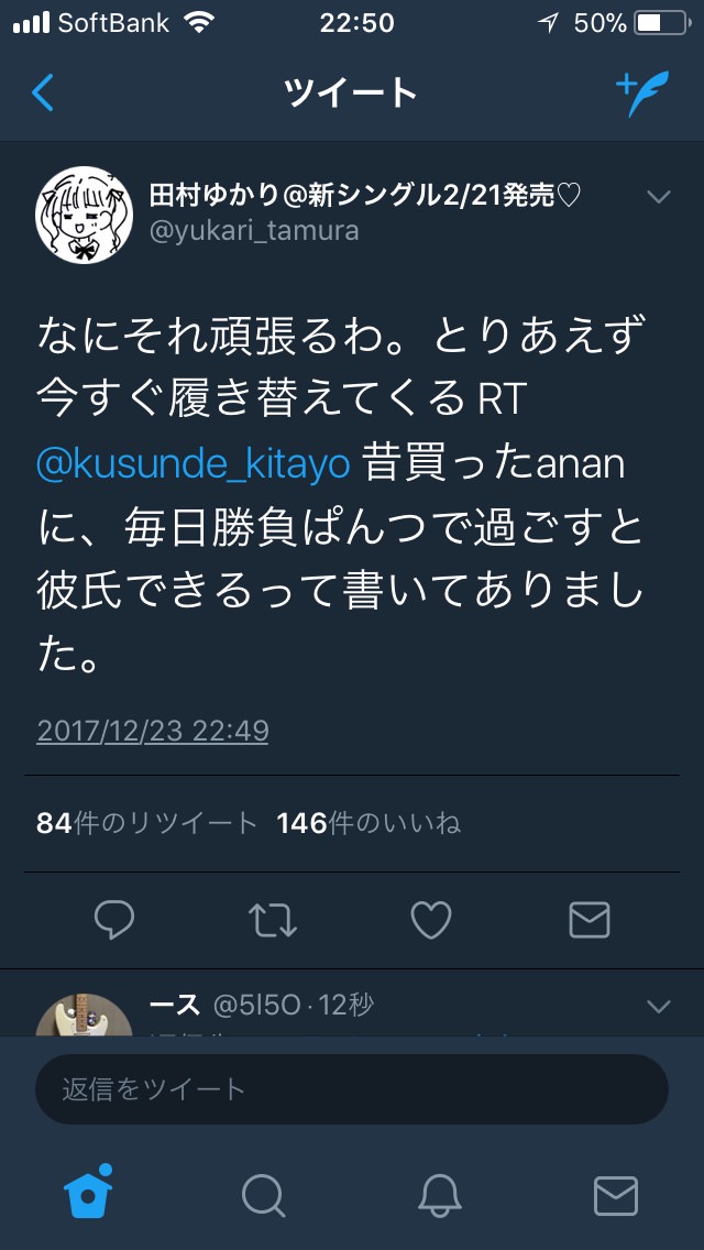 なにそれ頑張るわ。とりあえず今すぐ履き替えてくる RT @kusunde_kitayo 昔買ったananに、毎日勝負ぱんつで過ごすと彼氏できるって書いてありました。