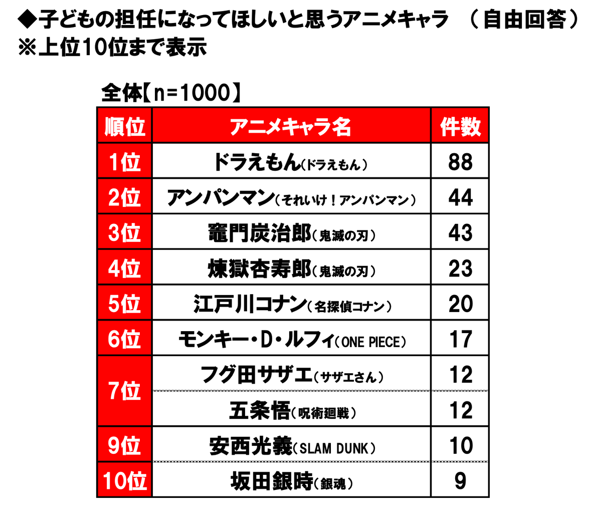 「子どもの担任になってほしいアニメキャラ」は? 3位「炭治郎」2位「アンパンマン」
