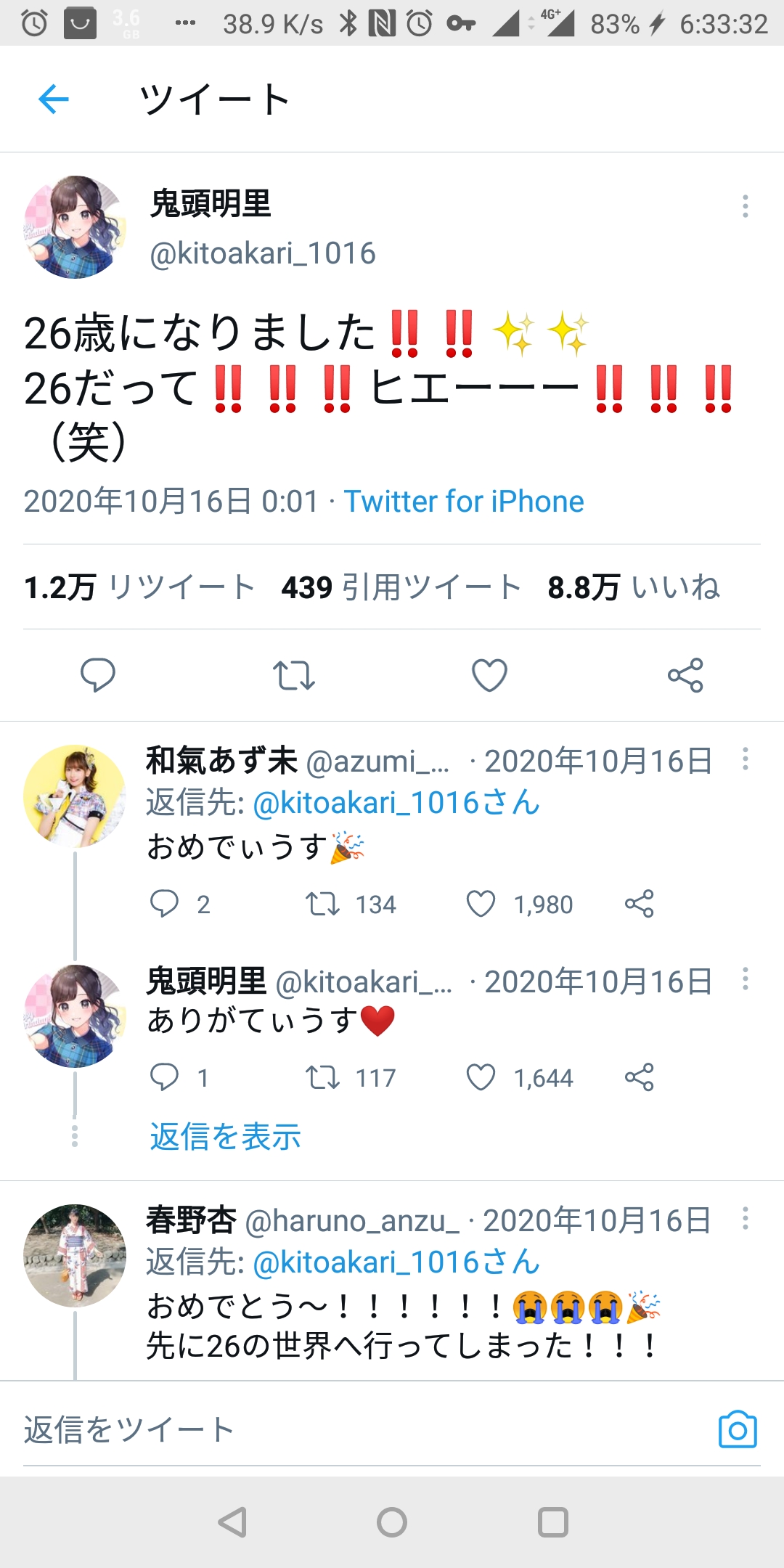 人気声優・鬼頭明里「26歳になりました!ヒエーーー!(笑)」