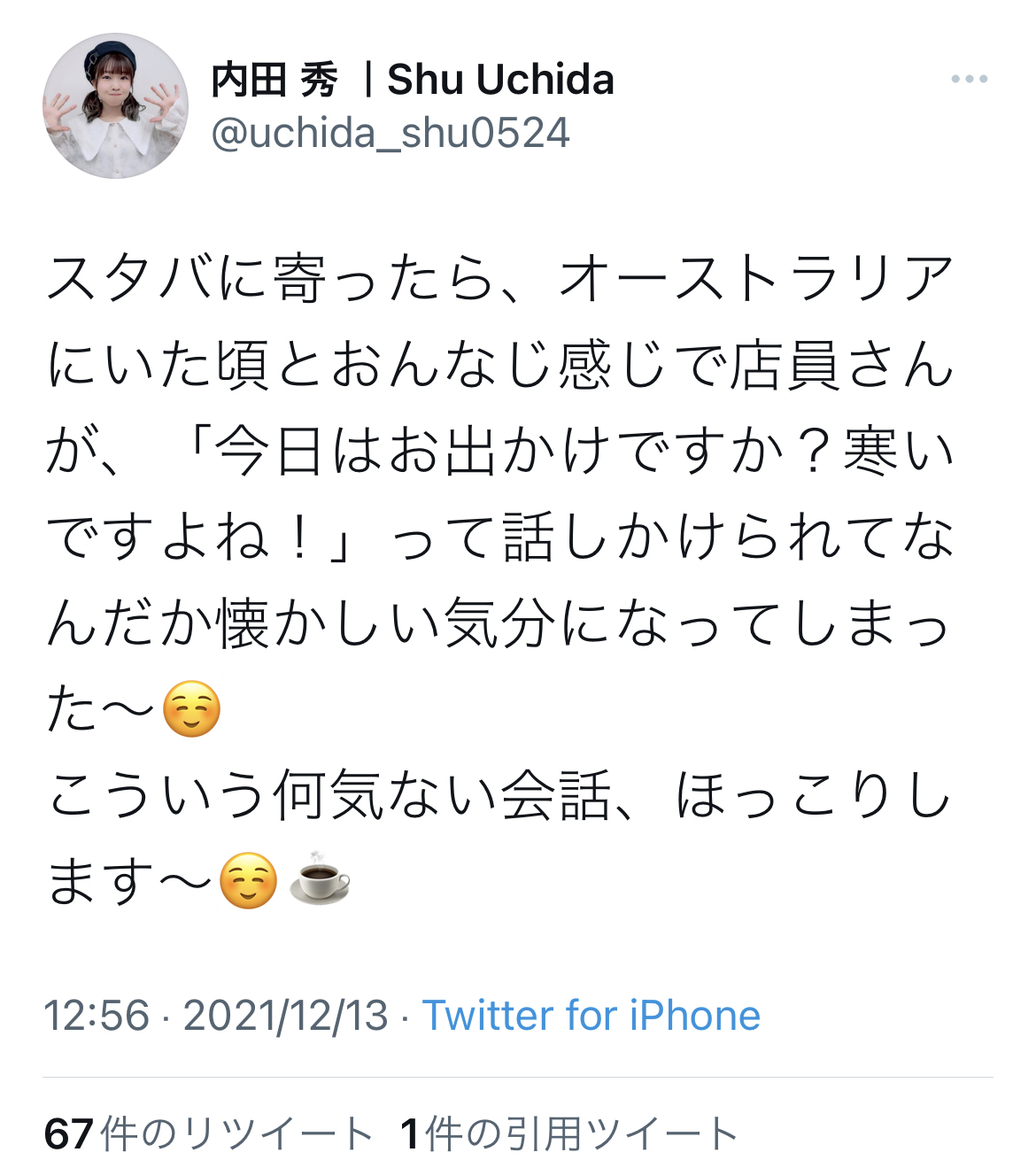 女性声優「日本でスタバに寄ったらオーストラリアにいた頃と同じ雰囲気味わえたわw」