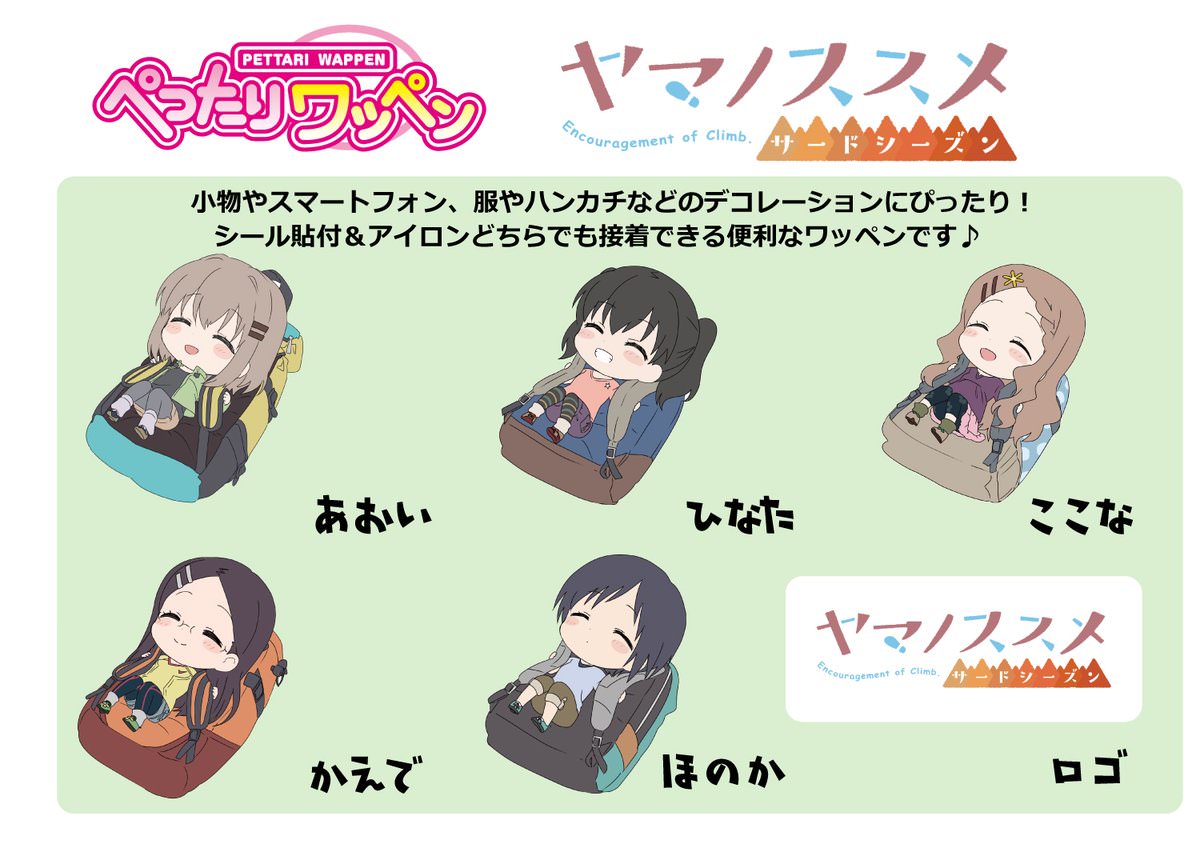 ☆開山祭 グッズ情報☆開山祭新作グッズ第1弾は新規描き下ろしイラストを使用した「ぺったりワッペンヤマノススメ」です☆リュックにゴロンとしている5人がとってもかわいいです^^シール貼付&アイロン接着どちらでもつけることができるので、会場で自分のお気に入りのアイテムをすぐにデコれます♪ pic.twitter.com/tiVhVd3u8E