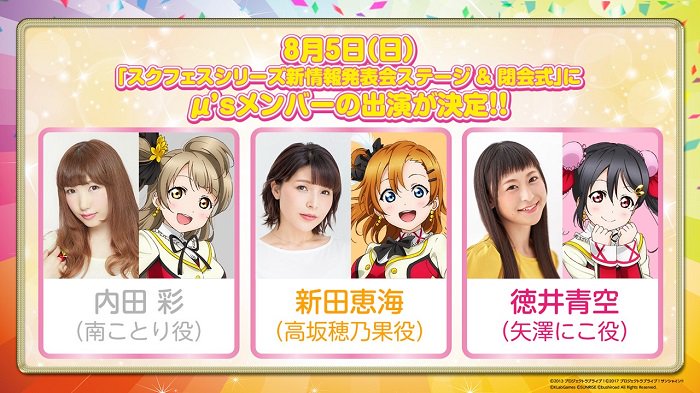 スクフェスシリーズ新情報発表会&閉会式にμ's3名出演決定💖#高坂穂乃果 役 新田恵海さん#南ことり 役 内田 彩さん#矢澤にこ 役 徳井青空さん#lovelive #スクフェス #スクスタ pic.twitter.com/tTXv3EVZ4K