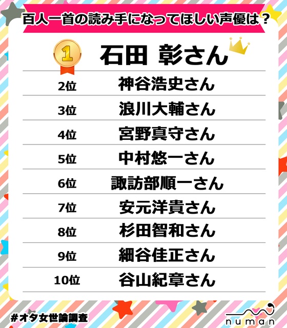 櫻井孝宏さん、百人一首の読み手になってほしい声優ランキングでランキング外