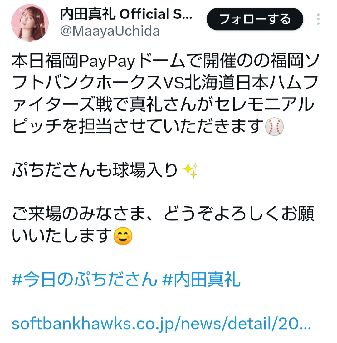 声優の内田真礼ちゃん、ソフトバンク戦でセレモニアルピッチを担当♪